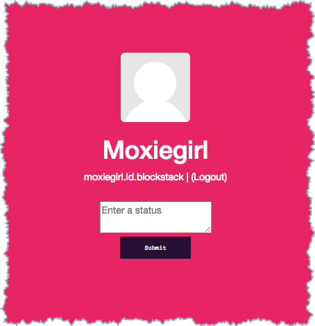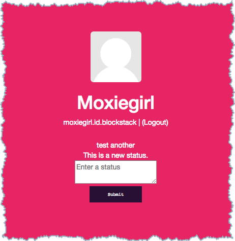 person.nameandperson.avatarURLproperties from the profile on the display:render() { const { handleSignOut, userSession } = this.props; const { person } = this.state; const { username } = this.state; return ( !userSession.isSignInPending() && person ? <div className="container"> <div className="row"> <div className="col-md-offset-3 col-md-6"> <div className="col-md-12"> <div className="avatar-section"> <img src={ person.avatarUrl() ? person.avatarUrl() : avatarFallbackImage } className="img-rounded avatar" id="avatar-image" /> <div className="username"> <h1> <span id="heading-name">{ person.name() ? person.name() : 'Nameless Person' }</span> </h1> <span>{username}</span> <span> | <a onClick={ handleSignOut.bind(this) }>(Logout)</a> </span> </div> </div> </div> <div className="new-status"> <div className="col-md-12"> <textarea className="input-status" value={this.state.newStatus} onChange={e => this.handleNewStatusChange(e)} placeholder="Enter a status" /> </div> <div className="col-md-12"> <button className="btn btn-primary btn-lg" onClick={e => this.handleNewStatusSubmit(e)} > Submit </button> </div> </div> </div> </div> </div> : null ); }This code allows the application to post statuses. It also displays the user’s Blockstack ID. To display this, your app must extract the ID from the user profile data.