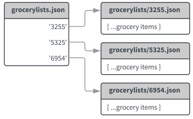 This design allows you to get only the files you need and avoid accidentally overwriting all lists. Further, you’re only updating the index file when you add or remove a grocery list; updating a list has no impact.