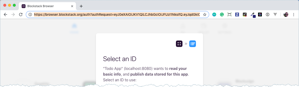 If you have already signed into Blockstack the application prompts you to select the ID to use. If you aren’t signed in, Blockstack prompts you to:
