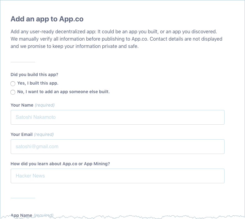 After you submit an app to the App.co site you must supply the additional details for your application to be complete. When you successfully submitted your application, you received a link to your submission on App.co. This link gives you the ability to submit your application details such as your tax and payment addresses.