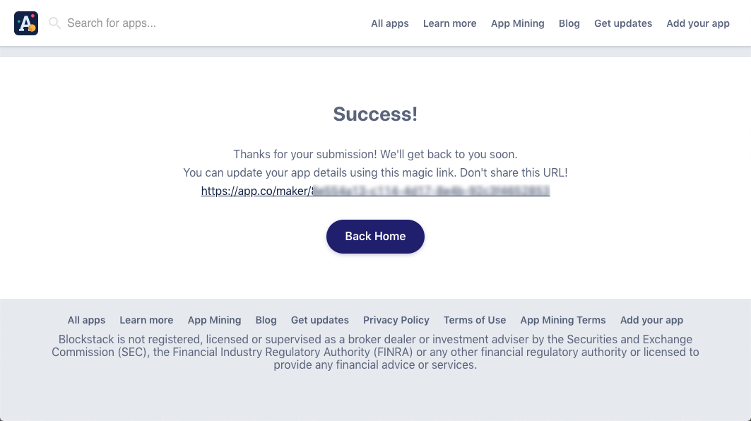 After you submit your materials, Blockstack verifies your information and your DApp appears in the list of registered apps.