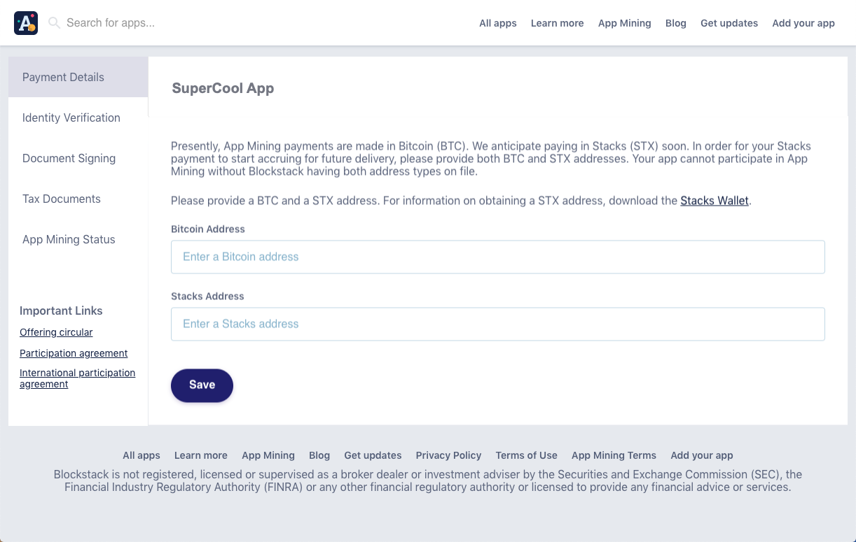 | Payment Details | Presently, App Mining payments are made in Bitcoin (BTC) but we anticipate paying in Stacks (STX) soon. For your Stacks payment to start accruing for future delivery, you must provide both BTC and STX addresses. Your app cannot participate in App Mining without Blockstack having both address types on file. To get a STX address, you need to install the Stacks Wallet. |