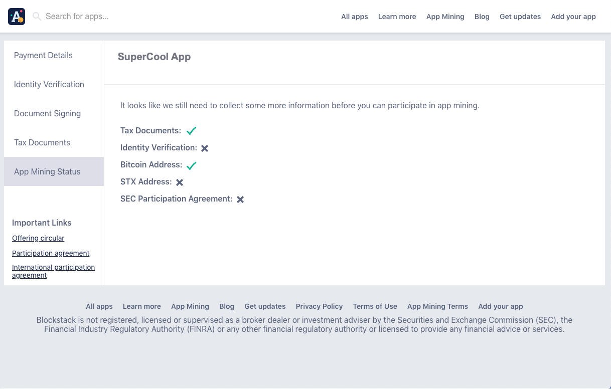 | Identity verification | We are ready to pay you Bitcoin and Stacks tokens for building a great Blockstack app, but we also need to comply with all applicable laws. This means we must confirm your identity before you can participate in App Mining. Identity verification is a process designed to confirm your identity and protect you from identity theft. You must submit an image of your ID document, which is checked to ensure it is legitimate and has not been altered or manipulated. Valid identity documents are a passport, an identity card, or a driver's license. |