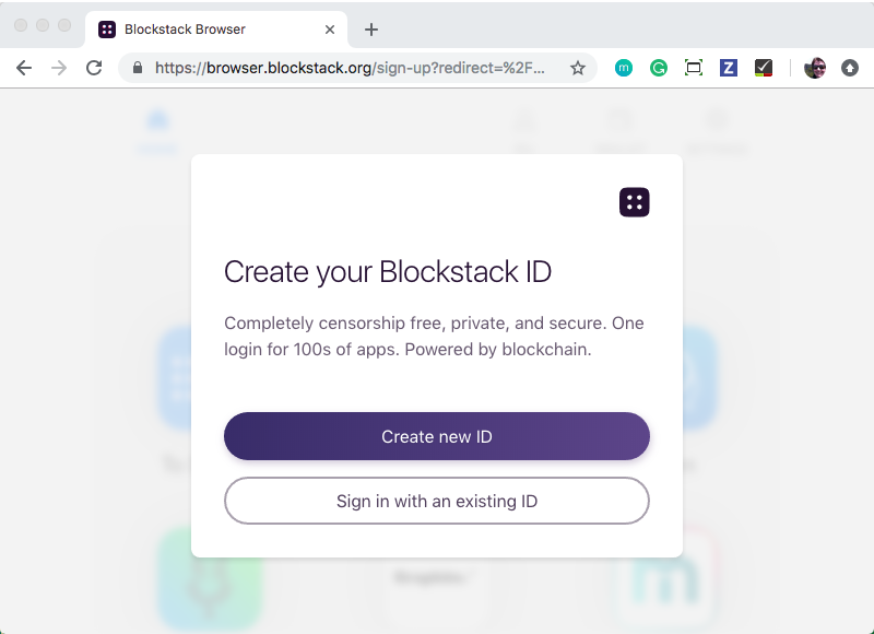 如果您已经有了一个Blockstack ID,那么启动浏览器并尝试重新设置它。或者尝试使用以前从未使用过的设备或浏览器软件登录。