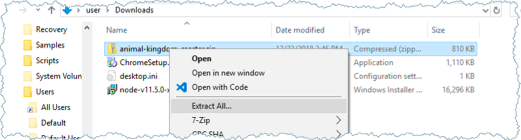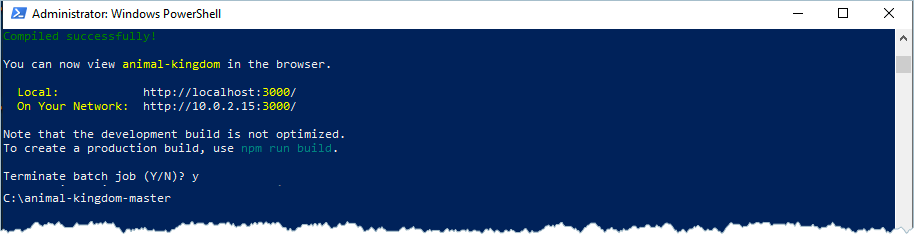 npm installto get the software components Animal Kingdom needs.C:\animal-kingdom-master> npm install > fsevents@1.2.4 install /Users/manthony/animal-kingdom-master/node_modules/fsevents > node install node-pre-gyp WARN Tried to download(404): https://fsevents-binaries.s3-us-west-2.amazonaws.com/v1.2.4/fse-v1.2.4-node-v67-darwin-x64.tar.gz node-pre-gyp WARN Pre-built binaries not found for fsevents@1.2.4 and node@11.1.0 (node-v67 ABI, unknown) (falling back to source compile with node-gyp) SOLINK_MODULE(target) Release/.node CXX(target) Release/obj.target/fse/fsevents.o In file included from ../fsevents.cc:6: ... added 1390 packages from 766 contributors and audited 15238 packages in 16.11s found 1 high severity vulnerability run `npm audit fix` to fix them, or `npm audit` for details C:\animal-kingdom-master>This command creates a