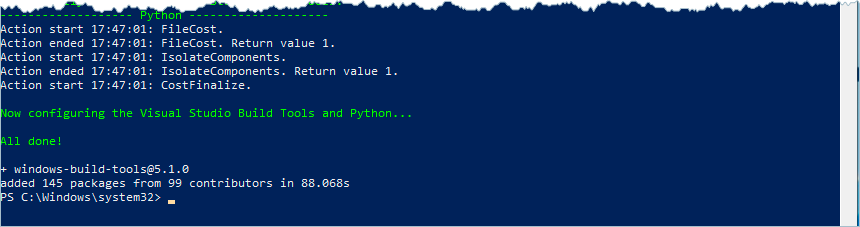 PS C:\windows\system32> npm install --global --production windows-build-toolsThis is installation can take a lot of time, when it is done, you see message similar to the following: