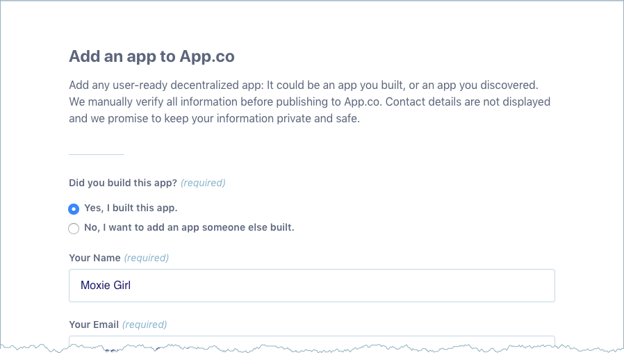 Field Description Your Name Your first and last name. Your Email A valid email address. If you are submitting an example of Animal Kingdom sample,this is the email where we will send you instructions for getting your Zero to DApp t-shirt. App Name Name of your application. If you are submitting an example of Animal Kingdom sample, enter USERNAME: Animal Kingdom.Short description Describe your application. Website The URL of the website where you deployed your application. App icon URL URL_DEPLOYED_SITE/icon-192x192.pngfor example,https://animalkingdoms.netlify.com/icon-192x192.pngOpen Source URL The URL where your source code lives. If you are submitting an example of Animal Kingdom sample, you can leave this blank for a sample application. Twitter Handle Optionally enter a Twitter handle for your application, for example `@coolapp`. Category If you are submitting an example of Animal Kingdom sample, make sure you choose the Sample Blockstack Apps category. Blockchain If you are submitting an example of Animal Kingdom sample, leave this as is. Storage Choose Gaia if you are using it. Authentication Choose Blockstack; Blockstack Authentication is required to participate in Animal Kingdom. - Check App is publicly accessible and user-ready.